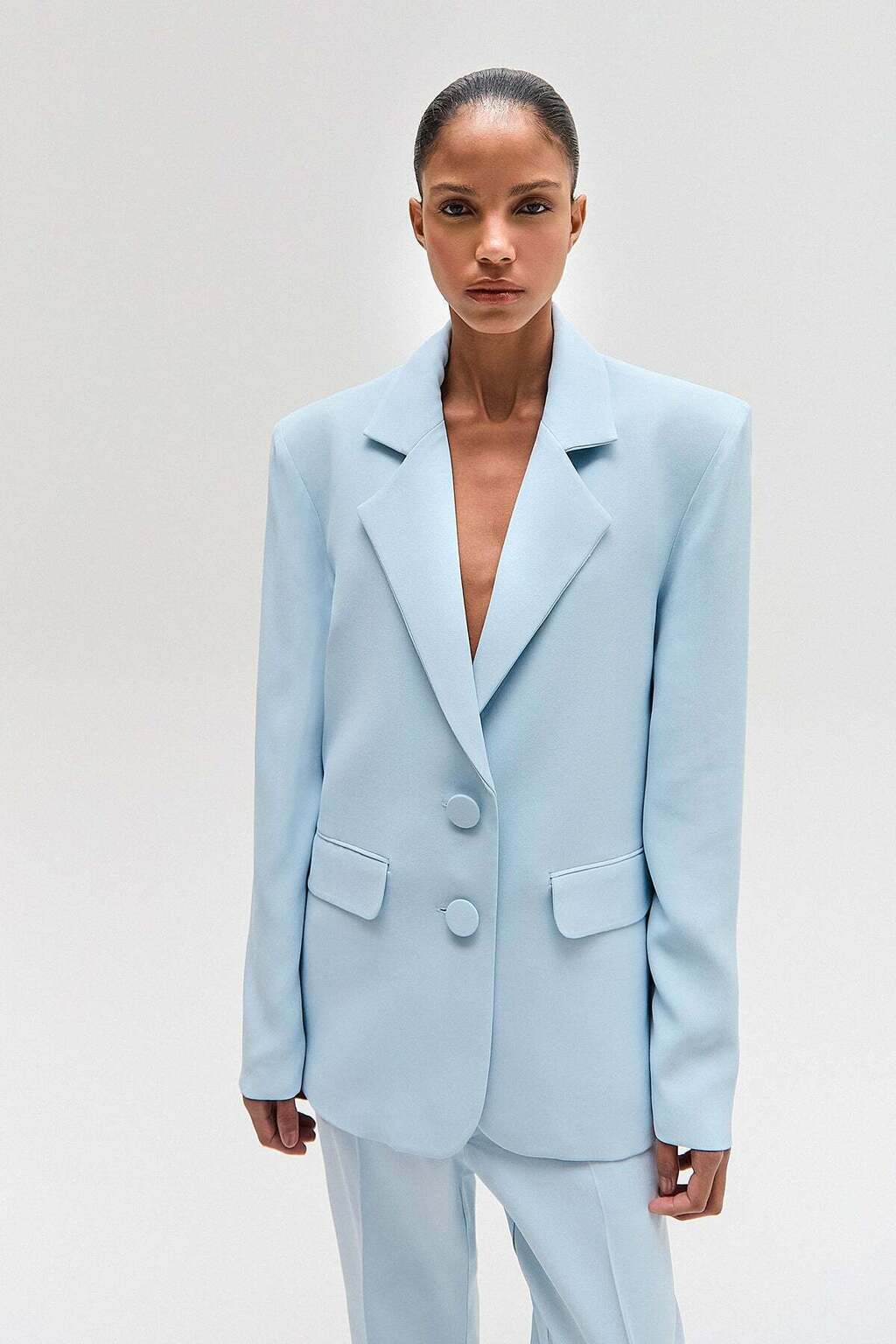 Blazer em tecido encorpado com toque de crepe, forro embutido e modelagem ampla. Possui manga comprida, bolsos fakes com lapela na frente e ombreiras. Fechamento por abotoamento frontal.